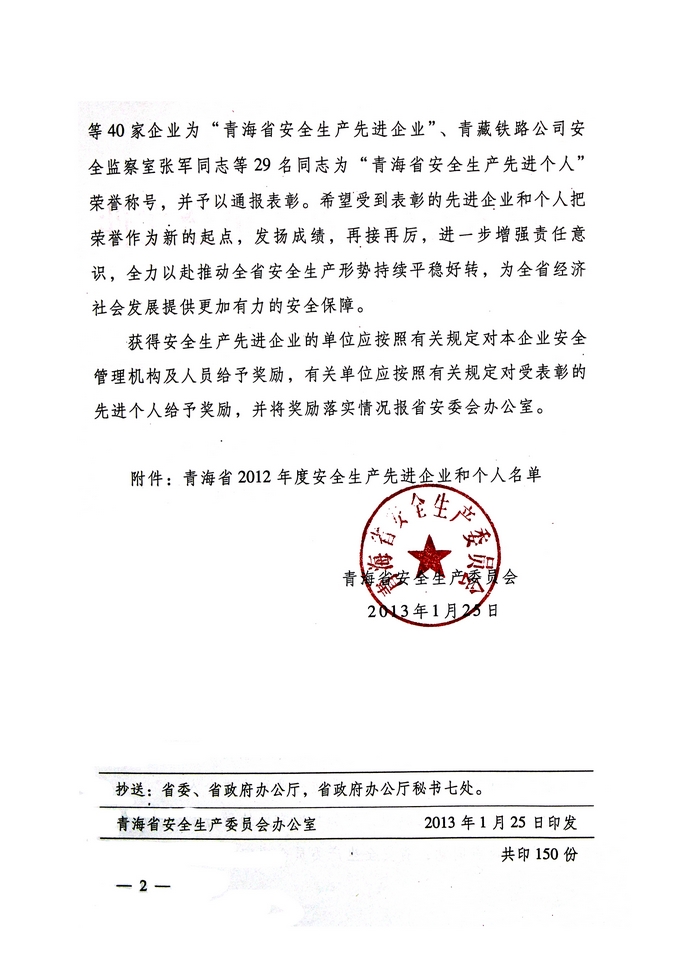 2012年,在省委、省政府的正確領(lǐng)導(dǎo)下,青海省物產(chǎn)集團(tuán)總公司認(rèn)真學(xué)習(xí)貫徹黨的十八大精神,全面貫徹落實(shí)科學(xué)發(fā)展觀,牢固樹立以人為本、安全發(fā)展的理念,深入開展"安全生產(chǎn)年"、"隱患排查治理"、"打非治違"等活動(dòng),為促進(jìn)全省安全生產(chǎn)形勢(shì)持續(xù)穩(wěn)定好轉(zhuǎn)做出了積極貢獻(xiàn)。為此,經(jīng)省政府同意,省安全生產(chǎn)委員會(huì)決定授予青海省物產(chǎn)集團(tuán)總公司"2012年度安全生產(chǎn)先進(jìn)企業(yè)"榮譽(yù)稱號(hào)。